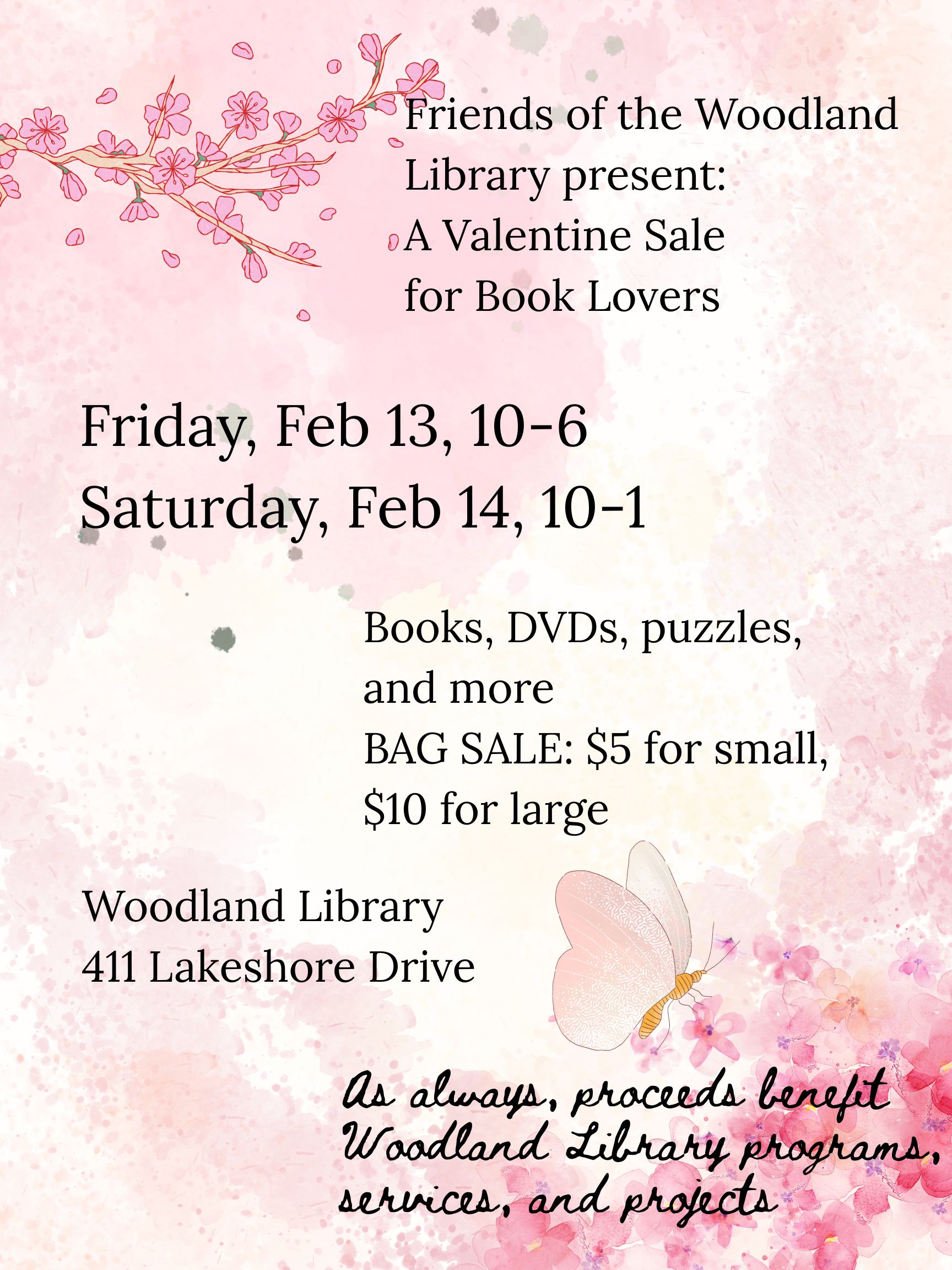 The Friends will hold a February book sale Friday, February 13th, from 10-6, and Saturday, February 14th, from 10-1! Meet us at the Woodland Library (411 Lakeshore) and browse our used book and media collection — lots of thrillers, romances, kids’ books, CDs, puzzles, and more.